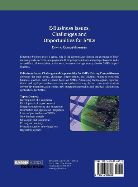 Electronic business plays a central role in the economy, facilitating the exchange of information, goods, services, and payments. It propels productivity and competitiveness and is accessible to all enterprises, and as such, represents an opportunity also for SME competitiveness. E-Business Issues, Challenges and Opportunities for SMEs: Driving Competitiveness discusses the main issues, challenges, opportunities, and solutions related to electronic business adoption, with a special focus on SMEs. Addressing technological, organizational, and legal perspectives in a very comprehensive way, this text aims to disseminate current developments, case studies, new integrated approaches, and practical solutions and applications for SMEs.