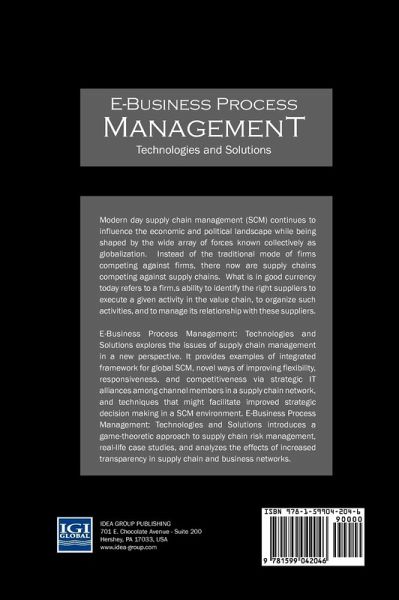 Modern day supply chain management (SCM) continues to influence the economic and political landscape while being shaped by the wide array of forces known collectively as globalization. Instead of the traditional mode of firms competing against firms, there now are supply chains competing against supply chains. What is in good currency today refers to a firm's ability to identify the right suppliers to execute a given activity in the value chain, to organize such activities, and to manage its relationship with these suppliers. E-Business Process Management: Technologies and Solutions explores the issues of supply chain management in a new perspective. It provides examples of integrated framework for global SCM, novel ways of improving flexibility, responsiveness, and competitiveness via strategic IT alliances among channel members in a supply chain network, and techniques that might facilitate improved strategic decision making in a SCM environment. E-Business Process Management: Technologies and Solutions introduces a game-theoretic approach to supply chain risk management, real-life case studies, and analyzes the effects of increased transparency in supply chain and business networks.
