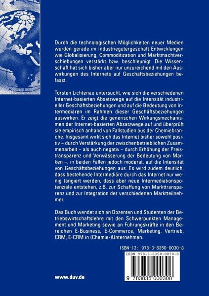 Torsten Lichtenau untersucht, wie sich die verschiedenen Internet-basierten Absatzwege auf die Intensität industrieller Geschäftsbeziehungen und auf die Bedeutung von Intermediären im Rahmen dieser Geschäftsbeziehungen auswirken. Er zeigt die generischen Wirkungsmechanismen der Internet-basierten Absatzwege auf und überprüft sie empirisch anhand von Fallstudien aus der Chemiebranche. Insgesamt wirkt sich das Internet bisher sowohl positiv - durch Verstärkung der zwischenbetrieblichen Zusammenarbeit - als auch negativ - durch Erhöhung der Preistransparenz und Verwässerung der Bedeutung von Marken -, in beiden Fällen jedoch moderat, auf die Intensität vonGeschäftsbeziehungen aus. Es wird zudem deutlich, dass bestehende Intermediäre durch das Internet nur wenig tangiert werden, dass aber neue Intermediationspotenziale entstehen, z.B. zur Schaffung von Markttransparenz und zur Integration der verschiedenen Marktteilnehmer.