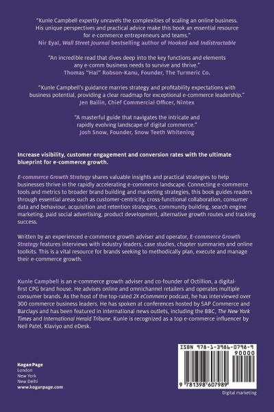 Chapter 00: Introduction; Chapter 01: How to think about and approach e commerce growth; Chapter 02: Collaborative cross functional growth; Chapter 03: Brand core the foundation for growth; Chapter 04: Consumer behaviour; Chapter 05: Customer data; Chapter 06: Customer acquisition; Chapter 07: Retention for long term growth; Chapter 08: Audience and community building why high growth e commerce brands are publishers; Chapter 09: Lifecycle marketing and personalized experiences; Chapter 10: Search engine marketing; Chapter 11: Paid social advertising; Chapter 12: Channel marketing; Chapter 13: Product development cycles for growth; Chapter 14: How to cultivate a culture of experimentation; Chapter 15: Alternative but effective routes to e commerce growth; Chapter 16: Finance what you should know and an overview for growth; Chapter 17: Tracking success team makeup and key metrics; Chapter 18: Develop your growth roadmap;