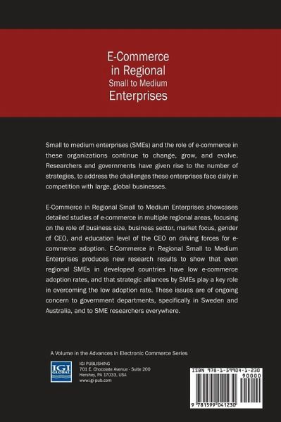 Small to medium enterprises (SMEs) and the role of e-commerce in these organizations continue to change, grow and evolve. Researchers and governments have given rise to the number of strategies, to address the challenges these enterprises face daily in competition with large, global businesses.E-Commerce in Regional Small to Medium Enterprises showcases detailed studies of e-commerce in multiple regional areas, focusing on the role of business size, business sector, market focus, gender of CEO, and education level of the CEO on driving forces for e-commerce adoption. E-Commerce in Regional Small to Medium Enterprises produces new research results to show that even regional SMEs in developed countries have low e-commerce adoption rates, and that strategic alliances by SMEs play a key role in overcoming the low adoption rate. These issues are of ongoing concern to government departments, specifically in Sweden and Australia, and to SME researchers everywhere.