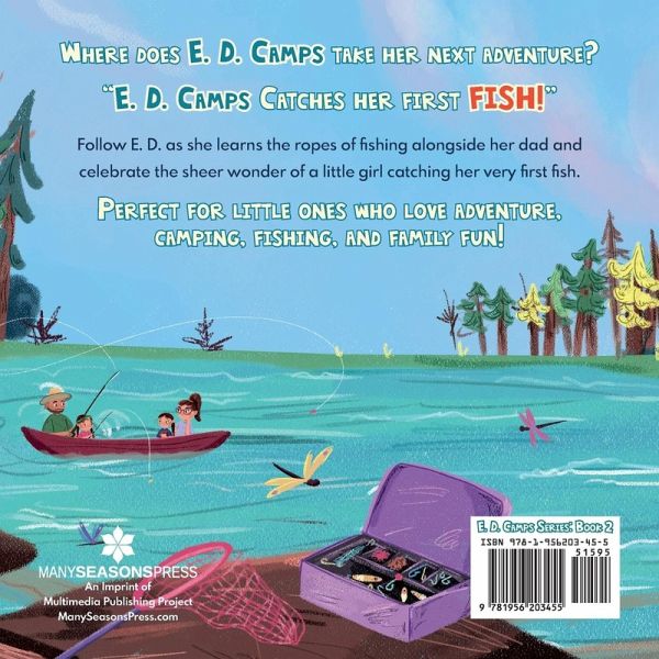 Where does E. D. Camps take her next adventure? E. D. Camps Catches Her First Fish! Is a charming fishing adventure exploring the bond between a father and a daughter. Follow E. D. and her family to the best camping spot by a lake! E. D. Camps follows alongside her dad as he baits a fishing line, casts a reel, and waits for a catch of the day. Perfect for little ones who love adventure, camping, fishing, and family fun!