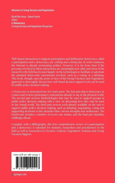Political Bases.- e-Democracy: A Group Decision and Negotiation-Oriented Overview.- Concepts in Democratic Theory.- Participatory Processes and Instruments.- Methodological Bases.- Problem-Structuring Methods for e-Democracy.- Decision Support Systems.- Collaborative Decision Analysis and e-Democracy.- Voting Theory.- Real-World Decision Aiding: A Case in Participatory Water Management.- Technological Bases.- The Internet and the Web.- e-Participation: A Discursive Approach.- e-Negotiation Systems for e-Participation.- Web-Based Decision Support: Creating a Culture of Applying Multi-criteria Decision Analysis and Web-Supported Participation in Environmental Decision Making.- A Generic System for Remote e-Voting Management.- Explanation Systems.- Case Studies.- Transparent Public Decision Making: Discussion and Case Study in Sweden.- From Participatory to e-Participatory Budgets.- Internet Voting in Estonia.- Consensus Building by Blended Participation in a Local Planning Process: The Case of the Public Stadium Swimming Pool in Bremen.- Future Prospects.- e-Democracy: The Road Ahead.