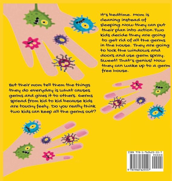 It's bedtime. Mom is cleaning instead of sleeping. A sister and brother decide they are going to surprise their MOM and get rid of all the germs in the house. Their plan is to lock all the windows and doors and spray the whole house with germ spray. That's genius! At least they think so. Now they can wake up to a germ-free house and Mom gets a break. But their Mom tells them the things they do every day is what causes germs and what gives it to others. Germs spread from kid to kid or surface to kid because kids are touchy feely. As they learn about the spread of germs they discover its' not as simple as one big spray.