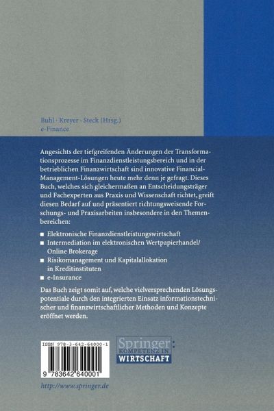 Angesichts der tiefgreifenden Änderungen der Transformationsprozesse im Finanzdienstleistungsbereich und in der betrieblichen Finanzwirtschaft sind innovative Financial-Management-Lösungen heute mehr denn je gefragt. Dieses Buch, welches sich gleichermaßen an Entscheidungsträger und Fachexperten aus Praxis und Wissenschaft richtet, greift diesen Bedarf auf und präsentiert richtungsweisende Forschungs- und Praxisarbeiten insbesondere in den Themenbereichen: Elektronische Finanzdienstleistungswirtschaft, Intermediation im elektronischen Wertpapierhandel/Online Brokerage, Risikomanagement und Kapitalallokation in Kreditinstituten und e-Insurance. Das Buch zeigt somit auf, welche vielversprechenden Lösungspotentiale durch den integrierten Einsatz informationstechnischer und finanzwirtschaftlicher Methoden und Konzepte eröffnet werden.