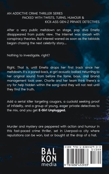 AN ADDICTIVE CRIME THRILLER SERIES PACKED WITH TWISTS, TURNS, HUMOUR & KICK-ASS GEN-Z PRIVATE DETECTIVES After a very public meltdown on stage, pop diva Emefa disappeared from public view. The Internet was awash with conspiracy theories. But interest waned as soon as the tabloids began chasing the next celebrity story... Nothing to investigate, right? Right. That is, until Emefa drops her first track since her meltdown. It's a pared-back, e-girl acoustic ballad, returning to her original sound from before the fame, boys, and brand management took over. Charlie and her team think there's a cry for help hidden within the song-and they will not rest until they find the truth. Add a serial killer targeting cougars, a cuckold seeking proof of infidelity, and a group of young, eager private detectives to the mix, and you get E-Girl Unplugged. Murder and mystery are peppered with action and humour in this fast-paced crime thriller, set in Liverpool-a city where reputations can be won, lost or bought at the drop of a hat.