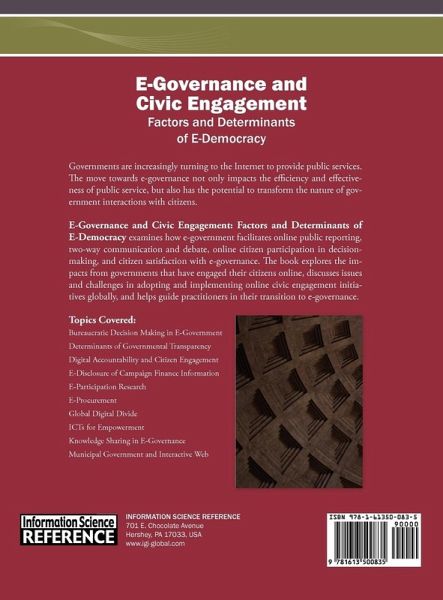 Governments are increasingly turning to the Internet to provide public services. The move towards e-governance not only impacts the efficiency and effectiveness of public service, but also has the potential to transform the nature of government interactions with citizens. E-Governance and Civic Engagement: Factors and Determinants of E-Democracy examines how e-government facilitates online public reporting, two-way communication and debate, online citizen participation in decision-making, and citizen satisfaction with e-governance. The book explores the impacts from governments that have engaged their citizens online, discusses issues and challenges in adopting and implementing online civic engagement initiatives globally, and helps guide practitioners in their transition to e-governance.