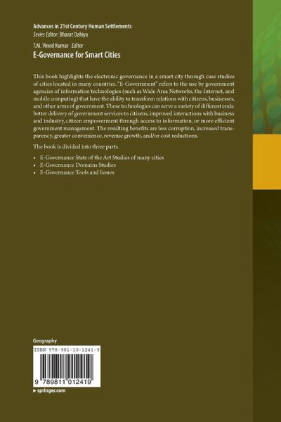 E-Governance for Smart Cities.- E-Governance State of the Art Survey: Stuttgart, Germany.- E-Governance and Smart Cities: Cases of Ahmedabad and Hyderabad.- E- Governance and its role in infrastructure services of UAE, case study- Dubai.- E-Governance for Public Realm: Around Panniyankara Monorail Station, Kozhikode, Kerala.- Smart Systems and Smart Grids for effective governance of electricity supply in India.- E-Governance for Solar Photo Voltaic Powergrid: Solar City Gandhinagar Gujarat, India.- Can Smart City Be an Inclusive City?-Spatial Targeting (SI) and Spatial Data Infrastructure (SDI).- M-Governance: Smart Phone Applications for Smarter Cities- Tapping GPS and NFC Technologies.- Participatory E-Budgeting using GIS based Spatial Decision Support System: Kozhikode Municipal Corporation.- Smart City E-Governance: Issues and Future.