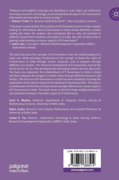 The book discusses the concepts of E-Governance from the understanding of a naïve user. While providing introduction to the concept, it shows the status of E-Governance in India through various measures, and its progress through different case studies. The historical development of E-Governance around the world and its rise in few developed and developing nations have also been discussed. The book also elaborates the establishment of E-Governance in India in detail and then compares the progress in Indian states through different measures and metrics. The structure of the E-Governance in India has been explained, including the explanation of the details related to National E-Governance Plan. The book is a combination of theoretical and practical concepts defined over various aspects of E-Governance in India. This book serves as the first stage reading material for any individual working in the Indian region on E-Governance.