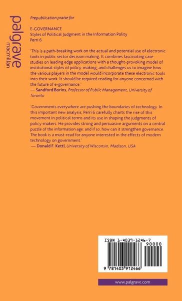 The e-governance revolution is said to be changing everything, but will all the modelling tools, electronic meeting management systems and online consultations really change political judgement in policy formation? Using case studies from local and federal government in the US and Europe, Perri 6 examines these claims and presents a new theory of how policymakers use and reject information and do and don't trust each other with information in using the new tools, before analyzing the implications for democracy.