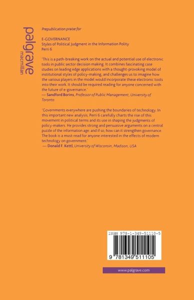 The e-governance revolution is said to be changing everything, but will all the modelling tools, electronic meeting management systems and online consultations really change political judgement in policy formation? Using case studies from local and federal government in the US and Europe, Perri 6 examines these claims and presents a new theory of how policymakers use and reject information and do and don't trust each other with information in using the new tools, before analyzing the implications for democracy.