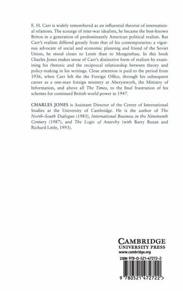 E. H. Carr is widely remembered as an influential theorist of international relations. The scourge of inter-war idealists, he became the best-known Briton in a generation of predominantly American political realists. But Carr's realism differed greatly from that of his contemporaries: a vigorous advocate of social and economic planning and friend of the Soviet Union, he stood closer to Lenin than to Morgenthau. In this book Charles Jones makes sense of Carr's distinctive form of realism by examining his rhetoric and the reciprocal relationship between theory and policy-making in his writings. Close attention is paid to the period from 1936, when Carr left the Foreign Office, through his subsequent career as a one-man foreign ministry at Aberystwyth, the Ministry of Information, and above all The Times, culminating in the final frustration of his schemes for continued British world power in 1947.