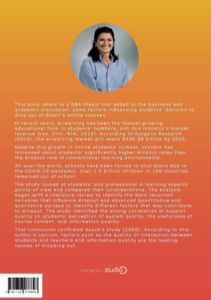 This book refers to a DBA thesis that added to the business and academic discussion, some factors influencing students' decision to drop out of Brazil's online courses. In recent years, e-learning has been the fastest growing educational form in students' numbers, and this industry's market revenue (Lee, Choi, Kim, 2013). According to Syngene Research (2019), the e-learning market will reach $336.98 billion by 2026. Despite this growth in online students' number, concern has increased about students' significantly higher dropout rates than the dropout rate in conventional learning environments. All over the world, schools have been forced to shut doors due to the COVID-19 pandemic. Over 1.2 billion children in 186 countries remained out of school. The study looked at students' and professional e-learning experts' points of view and compared their considerations. The analysis began with a literature review to identify the main recurrent variables that influence dropout and advanced quantitative and qualitative surveys to identify different factors that may contribute to dropout. The study identified the strong correlation of support quality on students' perception of system quality, the usefulness of course content, and information quality. That conclusion confirmed Souza's study (2009). According to this author's opinion, factors such as the quality of interaction between students and teachers and information quality are the leading causes of dropping out.