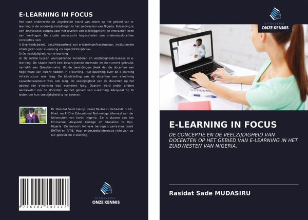 Het boek onderzoekt de uitgebreide stand van zaken op het gebied van e-learning in de onderwijsinstellingen in het zuidwesten van Nigeria. E-learning is een innovatieve aanpak voor het leveren van leerlinggericht en interactief leren aan leerlingen. De studie onderzocht hogescholen van onderwijsdocenten concepties van:i) Overheidsbeleid, beschikbaarheid van e-learninginfrastructuur, institutionele strategieën voor e-learning en capaciteitsopbouw.ii) De veelzijdigheid van e-learning.iii) De relatie tussen voorspellende variabelen en veelzijdigheidsniveaus in e-learning. De studie heeft een beschrijvende methode en instrument gebruikt, namelijk een Questionnaire. Uit de bevindingen bleek dat de docenten een hoge mate van inzicht hadden in e-learning. Hun opvatting over de e-learning infrastructuur was laag. De blootstelling van de docenten aan e-learning capaciteitsopbouw was ook laag. De veelzijdigheid van de docenten op het gebied van e-learning was eveneens laag. Daarom werd onder andere aanbevolen om de docenten op het gebied van e-learning adequaat op te leiden om hun veelzijdigheid te verbeteren.