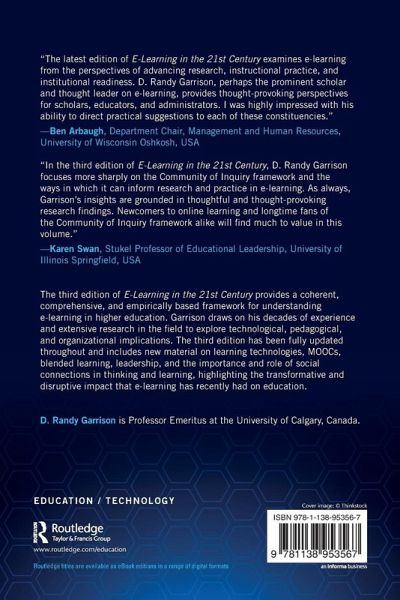 The third edition of E-Learning in the 21st Century provides a coherent, comprehensive, and empirically-based framework for understanding e-learning in higher education. Garrison draws on his decades of experience and extensive research in the field to explore technological, pedagogical, and organizational implications. The third edition has been fully updated throughout and includes new material on learning technologies, MOOCs, blended learning, leadership, and the importance and role of social connections in thinking and learning, highlighting the transformative and disruptive impact that e-learning has recently had on education.
