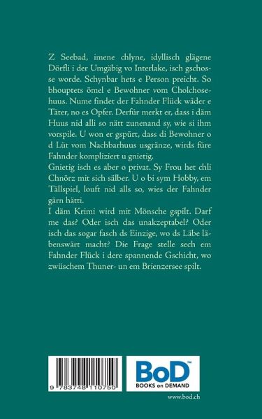 Z Seebad, imene chlyne, idyllisch glägene Dörfli i der Umgäbig vo Interlake, isch gschosse worde. Schynbar hets e Person preicht. So bhouptets ömel e Bewohner vom Cholchosehuus. Nume findet der Fahnder Flück wäder e Täter, no es Opfer. Derfür merkt er, dass i däm Huus nid alli so nätt zunenand sy, wie si ihm vorspile. U won er gspürt, dass di Bewohner o d Lüt vom Nachbarhuus usgränze, wirds füre Fahnder kompliziert u gnietig. Gnietig isch es aber o privat. Sy Frou het Chnörz mit sich sälber. U o bi sym Hobby, em Tällspiel, louft nid alls so, wies der Fahnder gärn hätti.I däm Krimi wird mit Mönsche gspilt. Darf me das? Oder isch das inakzeptabel? Oder isch das sogar fasch ds Einzige, wo ds Läbe läbenswärt macht? Die Frage stelle sech em Fahnder Flück i dere spannende Gschicht, wo zwüschem Thuner- un em Brienzersee spilt.
