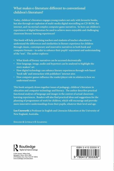 As ICT continues to grow as a key resource in the classroom, this book helps students and teachers to get the best out of e-literature, with practical ideas for work schemes for children at all levels. Len Unsworth draws together functional analyses of language and images and applies them to real-life classroom learning environments, developing pupils' understanding of 'text'. The main themes include: What kinds of literary narratives can be accessed electronically? How can language, pictures, sound and hypertext be analysed to highlight the story? How can digital technology enhance literary experiences through web-based 'book talk' and interaction with publishers' websites? How do computer games influence the reader/ player role in relation to how we understand stories?