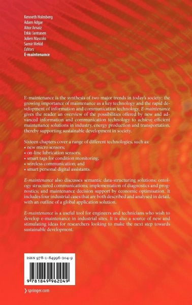 E-maintenance is the synthesis of two major trends in today's society: the growing importance of maintenance as a key technology and the rapid development of information and communication technology. E-maintenance gives the reader an overview of the possibilities offered by new and advanced information and communication technology to achieve efficient maintenance solutions in industry, energy production and transportation, thereby supporting sustainable development in society.Sixteen chapters cover a range of different technologies, such as: new micro sensors, on-line lubrication sensors, smart tags for condition monitoring, wireless communication and smart personal digital assistants.E-maintenance also discusses semantic data-structuring solutions; ontology structured communications; implementation of diagnostics and prognostics; and maintenance decision support by economic optimisation. It includes four industrial cases that are both described and analysed in detail, with an outline of a global application solution.E-maintenance is a useful tool for engineers and technicians who wish to develop e-maintenance in industrial sites. It is also a source of new and stimulating ideas for researchers looking to make the next step towards sustainable development.