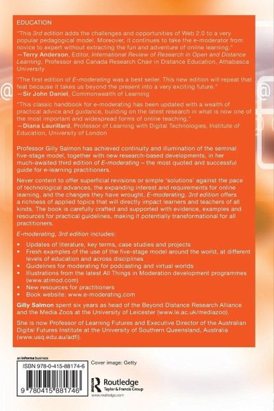 Gilly Salmon has achieved continuity and illumination of the seminal five stage model, together with new research-based developments, in her much-awaited third edition of E-moderatingâ the most quoted and successful guide for e-learning practitioners.