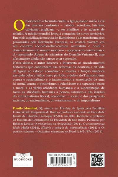 O movimento reformista cindiu a Igreja, dando início à era das diversas confissões ¿ católica, ortodoxa, luterana, calvinista, anglicana ¿, aos conflitos e às guerras de religião. A missão mundial levou à conquista de novos territórios. Em meio à civilização nascida do Iluminismo e das transformações provocadas pela Revolução Francesa, os cristãos viveram em um contexto sócio-filosófico-cultural naturalista e hostil e distanciaram-se do mundo moderno ¿ apostasia dos intelectuais e do operariado. Apesar de iniciativas do Concílio Vaticano II, esse afastamento ainda não parece estar superado. Nesta síntese, o autor descreve e interpreta os encadeamentos históricos que conduziram das reformas da doutrina e da vida da Igreja ao esforço ecumênico e ressalta a função histórica exercida pelos cristãos nesse período: a defesa do Transcendente contra o racionalismo e o imanentismo; a sustentação de uma lei moral contra o positivismo, o relativismo e a separação entre a moral e as várias atividades humanas; e a subordinação de todas as atividades humanas à pessoa, salvando-a das insídias do individualismo liberal, econômico e social, e dos perigos do racismo, do nacionalismo, do totalitarismo e do imperialismo.