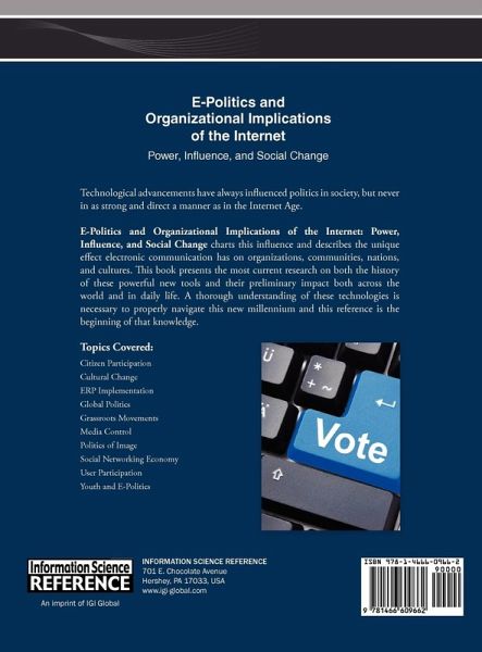 Technological advancements have always influenced politics in society, but never in as strong and direct a manner as in the Internet Age. E-Politics and Organizational Implications of the Internet: Power, Influence, and Social Change charts this influence and describes the unique effect electronic communication has on organizations, communities, nations, and cultures. This book presents the most current research on both the history of these powerful new tools and their preliminary impact both in across the world and in daily life. A thorough understanding of these technologies is necessary to properly navigate this new millennium and this reference is the beginning of that knowledge.