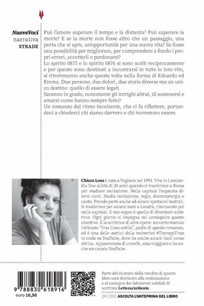 Può l'amore superare il tempo e la distanza? Può superare la morte? E se la morte non fosse altro che un passaggio, una porta che si apre, un'opportunità per una nuova vita? Se fosse una possibilità per migliorare, per comprendere a fondo i propri errori, accettarli e perdonarsi? Lo spirito 0875 e lo spirito 0876 si sono scelti reciprocamente e per questo sono destinati a incontrarsi in tutte le loro vite, si ritroveranno anche questa volta nella forma di Edoardo ed Emma. Due persone, due dolori, due storie diverse ma un unico destino: quello di essere legati. Saranno in grado, nonostante gli intrighi altrui, di sostenersi e amarsi come hanno sempre fatto? Un romanzo dal ritmo incalzante, che ci fa riflettere, portandoci a chiederci chi siamo davvero e chi vorremmo essere. Chiara Losa è nata a Voghera nel 1993. Vive in Lombardia fino all'età di 20 anni quando si trasferisce a Roma per studiare recitazione. Nella capitale frequenta diversi corsi. Studia recitazione, regia, drammaturgia e canto. Prende parte anche ad alcuni spettacoli teatrali. Si trasferisce per alcuni mesi a Londra, ritornando poi nella capitale. Il suo sogno è quello di diventare un'attrice. Ogni giorno si impegna nel conseguire questo obiettivo. È la scrittrice di altre opere: un corto teatrale intitolato "Una linea sottile", padre di questo romanzo, ed è una delle autrici della webseries #TherapyTime in onda su YouTube, dove ha anche alcuni ruoli come attrice. Appassionata di crossfit, ama viaggiare e ha anche un canale YouTube.
