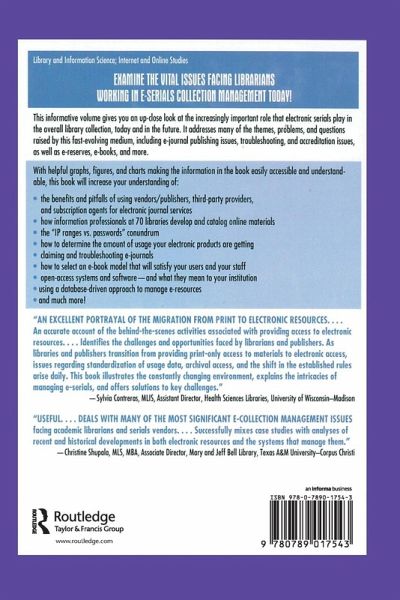 Learn how information professionals are addressing the electronic resource issues being faced in their own libraries and around the world! This informative volume gives you an up-close look at the increasingly important role that electronic serials play in the overall library collection, today and in the future. It addresses many of the themes, problems, and questions raised by this fast-evolving medium, including e-journal publishing issues, troubleshooting, and accreditation issues, as well as e-reserves, e-books, and more. In E-Serials Collection Management: Transitions, Trends, and Technicalities, library professionals from the United States, Canada, United Kingdom, and Australia discuss these issues, the problems they have faced, and the solutions they have developed for them. From the editor: It is my belief that e-serials will continue to emerge as the key players in the library world, as the physical library gradually and inexorably gives way to the virtual library. As e-journals insinuate themselves throughout the infrastructures of libraries and expand their reach globally, the issues addressed in this book are becoming of concern to all librarians, not just the electronic resources and information technology specialists. Librarians all over the world are struggling with how to manage electronic serials and the issues associated with them. In this book, readers will see how library professionals just like themselves deal with electronic journals, their transitions, trends, and technicalities. With helpful graphs, figures, and charts making the information in the book easily accessible and understandable, E-Serials Collection Management: Transitions, Trends, and Technicalities will increase your understanding of: the interrelationship between pricing, licensing, technological aspects, and proximity to publishers and librariesfrom the point of view of a leading global subscription agent the benefits and pitfalls of using vendors/publishers, third-party providers, and subscription agents for electronic journal services how information professionals are currently developing and cataloging online materialswith a survey of 70 libraries! the IP ranges vs. passwords conundrum the advantages of joining a consortium to make journals available to users at a lower cost to your library how to determine the amount of usage your electronic products are getting claiming and troubleshooting e-journalswith a fascinating case study from UCLA's biomedical library how to efficiently handle electronic articles destined for a reserve collection how to select an e-book model that will satisfy your users and your staff open-access systems and softwareand what they mean to your institution regional accreditation for e-serials using a database-driven approach to manage e-resources and more!