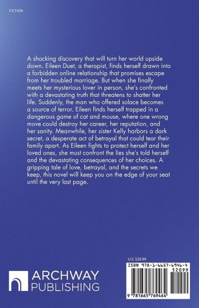 A shocking discovery that will turn her world upside down. Eileen Duet, a therapist, finds herself drawn into a forbidden online relationship that promises escape from her troubled marriage. But when she finally meets her mysterious lover in person, she's confronted with a devastating truth that threatens to shatter her life. Suddenly, the man who offered solace becomes a source of terror. Eileen finds herself trapped in a dangerous game of cat and mouse, where one wrong move could destroy her career, her reputation, and her sanity. Meanwhile, her sister Kelly harbors a dark secret, a desperate act of betrayal that could tear their family apart. As Eileen fights to protect herself and her loved ones, she must confront the lies she's told herself and the devastating consequences of her choices. A gripping tale of love, betrayal, and the secrets we keep, this novel will keep you on the edge of your seat until the very last page.