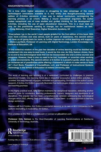 The world of learning and teaching is at a watershed; confronted by challenges to previous educational models. One learning future lies in impactful, purposeful, active online activities, or 'e-tivities', that keep learners engaged, motivated, and participating. Grounded in the author's action research, E-tivities, 2nd Edition assuredly illustrates how technologies shape and enhance learning and teaching journeys.