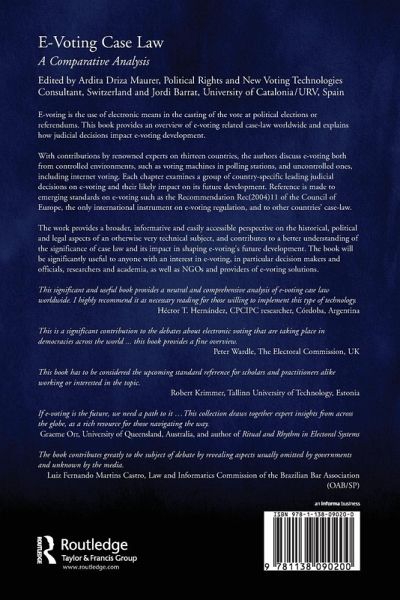 E-voting is the use of electronic means in the casting of the vote at political elections or referendums. This book provides an overview of e-voting related case-law worldwide and explains how judicial decisions impact e-voting development. With contributions by renowned experts on thirteen countries, the authors discuss e-voting both from controlled environments, such as voting machines in polling stations, and uncontrolled ones, including internet voting. Each chapter examines a group of country-specific leading judicial decisions on e-voting and their likely impact on its future development. Reference is made to emerging standards on e-voting such as the Recommendation Rec(2004)11 of the Council of Europe, the only international instrument on e-voting regulation, and to other countries' case-law. The work provides a broader, informative and easily accessible perspective on the historical, political and legal aspects of an otherwise very technical subject, and contributes to a better understanding of the significance of case law and its impact in shaping e-voting's future development. The book will be significantly useful to anyone with an interest in e-voting, in particular decision makers and officials, researchers and academia, as well as NGOs and providers of e-voting solutions.
