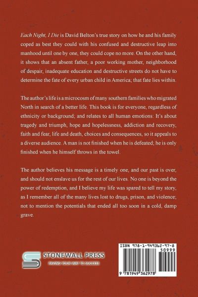 Each Night, I Die: Reload is David Belton's true story on how he and his family coped as best they could with his confused and destructive leap into manhood until one by one, they could cope no more. On the other hand, it shows that an absent father, a poor working mother, neighborhood of despair, inadequate education and destructive streets do not have to determine the fate of every urban child in America; that fate lies within. The author's life is a microcosm of many southern families who migrated North in search of a better life. This book is for everyone, regardless of ethnicity or background; and relates to all human emotions: It's about tragedy and triumph, hope and hopelessness, addiction and recovery, faith and fear, life and death, choices and consequences, so it appeals to a diverse audience. A man is not finished when he is defeated; he is only finished when he himself throws in the towel. The author believes his message is a timely one, and our past is over, and should not enslave us for the rest of our lives. No one is beyond the power of redemption, and I believe my life was spared to tell my story, as I remember all of the many lives lost to drugs, prison, and violence; not to mention the potentials that ended all too soon in a cold, damp grave.