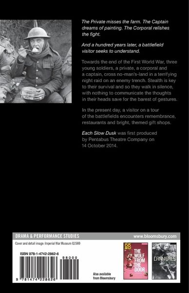 The Private misses the farm. The Captain dreams of painting. The Corporal relishes the fight. And a hundred years later, The Woman seeks to understand. 1916 - In the darkness of the French night, three young soldiers, a private, a corporal and a captain, cross no man's land towards the enemy trench. Stealth is key to their survival and so they walk in silence, with nothing to communicate the thoughts in their heads save for the barest of gestures. 2014 - A woman goes on a day trip to visit the touristic monuments commemorating the Battle of the Somme at Vimy Ridge and the Loghnagar Crater - the site of a mine explosion that killed over 6,000 people - where she encounters remembrance, restaurants and bright, themed gift shops. Each Slow Dusk is a startling play about action, humanity, and the legacy of war. Immersing you in the reality of conflict through vivid, thrilling detail, it gives you a fresh way of thinking about war - from the past soldiers' perspective to the woman's present-day experience. Each Slow Dusk was published to coincide with the first production and national tour of the play by Pentabus Rural Theatre Company, in autumn, 2014.