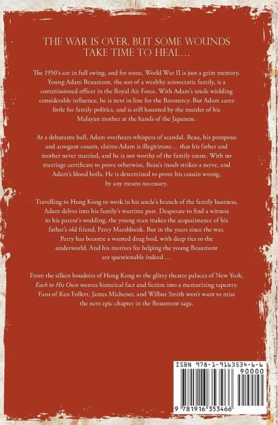 The war is over. But some wounds take time to heal... The 1950's are in full swing, and for some, World War II is just a grim memory. Young Adam Beaumont, the son of a wealthy aristocratic family, is a commissioned officer in the Royal Air Force. With Adam's uncle wielding considerable influence, he is next in line for the Baronetcy. But Adam cares little for family politics, and is still haunted by the murder of his Malayan mother at the hands of the Japanese. At a debutante ball, Adam overhears whispers of scandal. Beau, his pompous and arrogant cousin, claims Adam is illegitimate... that his father and mother never married, and he is not worthy of the family estate. With no marriage certificate to prove otherwise, Beau's insult strikes a nerve, and Adam's blood boils. He is determined to prove his cousin wrong, by any means necessary... Traveling to Hong Kong to work in his uncle's branch of the family business, Adam delves into his family's wartime past. Desperate to find a witness to his parent's wedding, the young man makes the acquaintance of his father's old friend, Perry Marshbank. But in the years since the war, Perry has become a wanted drug lord, with deep ties to the underworld. And his motives for helping the young Beaumont are questionable indeed... From the silken boudoirs of Hong Kong to the glitzy theatre palaces of New York, Each to His Own weaves historical fact and fiction into a memorizing tapestry. Fans of Ken Follett, James Michener, and Wilbur Smith won't want to miss the next epic chapter in the Beaumont saga.