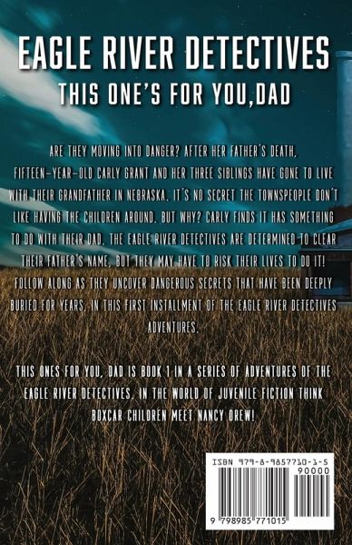 Moving is no fun when you are 15 years old, and to Carly Grant moving to a small town in Nebraska is a a nightmare! Still, she has to admit, there's more to this sleepy little town than she anticipated-including a handsome new boyfriend! Their mom is working outside the country, so Carly and her 3 siblings have to pull together when with their grandfather starts getting forgetful. In addition, things start turning weird, and they form the Eagle River Detectives, determined to uncover hidden family secrets. As they dig deep, they must risk everything - including their lives - to uncover the truth. Eagle River Detectives, Book1 This One's for You, Dad is the first installment in a thrilling new series that will keep readers on the edge of their seats. If you love books like Nancy Drew, The Boxcar Children, and The Hardy Boys, you won't be able to put this one down. Get your copy now! This book includes an offer for a FREE bundle of activity sheets.