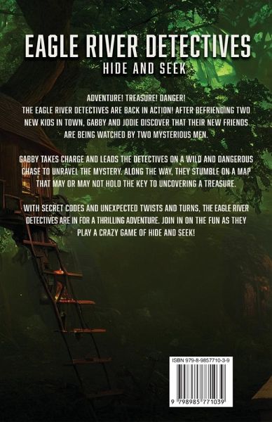 The Eagle River Detectives are back in action! After befriending two new kids in town, Gabby and Jodie discover that their new friends are being watched by two mysterious men. Gabby takes charge and leads the detectives on a wild and dangerous chase to unravel the mystery. Along the way, they stumble on a map that may or may not hold the key to uncovering a treasure. With secret codes and unexpected twists and turns, the Eagle River Detectives are in for a heart-pounding, thrilling adventure. Join in on the fun as the siblings play a crazy game of Hide and Seek! This book has a a set of downloadable activity sheets with purchase.