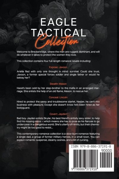 Welcome to Breckenridge, where the men are rugged, dominant, and will do whatever it takes to protect the women they love. This collection contains four full-length romance novels including: Expose: Jaxson Ariella fled with only one thought in mind: survival. Could she trust, Jaxson, a former special forces soldier and single father or would he betray her? Stealth: Mason Hazel's been sold by her step-brother to the mafia in an arranged marriage. She enlists the help of an old flame, Mason, to rescue her. Conceal: Lincoln Hired to protect the sassy and troublesome starlet, Harper, he can't mix business with pleasure. Except she doesn't know he's been hired as her bodyguard. Covert: Jayden Bad boy Jayden enlists Skylar, his best friend's sinfully sexy sister, to help find his missing niece - which means she has to pose as his fiancee to go undercover in a dangerous world. She's utterly off-limits, but their chemistry might be too good to resist… This contemporary romance collection is a slow burn romance featuring a grumpy single dad, a group of former military brothers, in a small town in Montana. You can expect romantic suspense, steamy scenes, and a bit of cursing. If that's not your thing or you're under 18, please move along.