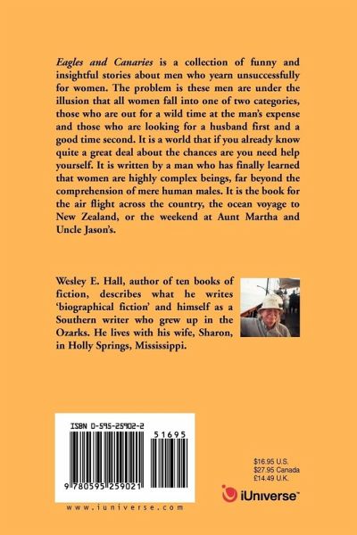 Eagles and Canaries is a collection of funny and insightful stories about men who yearn unsuccessfully for women. The problem is these men are under the illusion that all women fall into one of two categories, those who are out for a wild time at the man's expense and those who are looking for a husband first and a good time second. It is a world that if you already know quite a great deal about the chances are you need help yourself. It is written by a man who has finally learned that women are highly complex beings, far beyond the comprehension of mere human males. It is the book for the air flight across the country, the ocean voyage to New Zealand, or the weekend at Aunt Martha and Uncle Jason's.