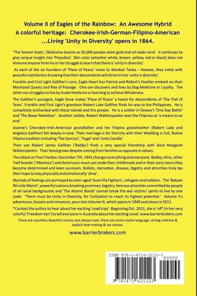 As each of the six founders of 'Place of Peace' move to Wankan Tanka - Heaven, they smile with peaceful satisfaction. Franklin and First Light Galliher's sons embark on their Manhood Quests and Rite of Passage. One son discovers and lives by Dog Medicine or Loyalty. The other son struggles to live by Snake Medicine or learning to achieve Wholeness. Eagle Dove makes 'Place of Peace' a haven for descendents of 'The Trail of Tears'. Franklin and First Light's grandson Robert Luke Galliher is completely enchanted with the Philippine Islands. He is a soldier in Dewey's 'One Day Battle' and 'The Boxer Rebellion'. Robert Waltenspielen sees the Filipinos as 'a means to an end'. Joanne's grandfather Galliher and Filipino grandmother fall deeply in-love. Their marriage is for Eternity with their Wedding in full, festive Filipino tradition including 'The Sanctus', 'Yugal' and 'Unity Candle'.