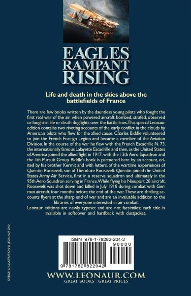 Life and death in the skies above the battlefields of France There are few books written by the dauntless young pilots who fought the first real war of the air when powered aircraft bombed, strafed, observed or fought in life or death dogfights over the battle lines. This special Leonaur edition contains two riveting accounts of the early conflict in the clouds by American pilots who flew for the allied cause. Charles Biddle volunteered to join the French Foreign Legion and became a member of the Aviation Division. In the course of the war he flew with the French Escadrille N. 73, the internationally famous Lafayette Escadrille and then, as the United States of America joined the allied fight in 1917, with the 13th Aero Squadron and the 4th Pursuit Group. Biddle's book is partnered here by an account, edited by his brother Kermit and with letters, of the wartime experiences of Quentin Roosevelt, son of Theodore Roosevelt. Quentin joined the United States Army Air Service, first in a reserve squadron and ultimately in the 95th Aero Squadron serving in France. While flying his Nieuport 28 aircraft, Roosevelt was shot down and killed in July 1918 during combat with German aircraft, four months before the end of the war. These are thrilling accounts flyers at the sharp end of war and are an invaluable addition to the libraries of everyone interested in air combat. Leonaur editions are newly typeset and are not facsimiles; each title is available in softcover and hardback with dustjacket.