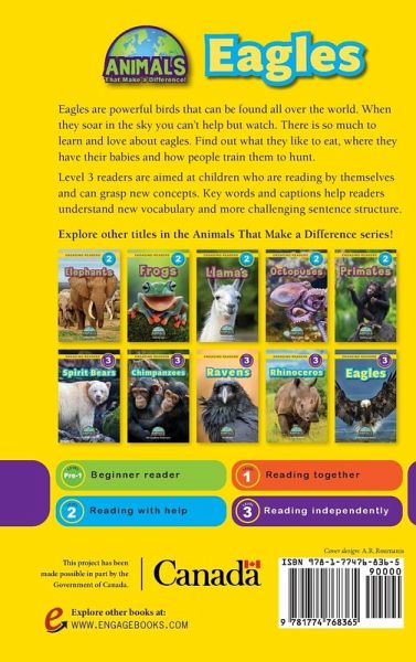 Eagles are powerful birds that can be found all over the world. When they soar in the sky you can't help but watch. There is so much to learn and love about eagles. Find out what they like to eat, where they have their babies and how people train them to hunt. Level 3 readers are aimed at children who are reading by themselves and can grasp new concepts. Key words and captions help readers understand new vocabulary and more challenging sentence structure. ¿This project has been made possible in part by the Government of Canada.