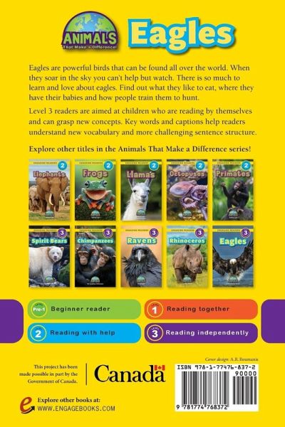 Eagles are powerful birds that can be found all over the world. When they soar in the sky you can't help but watch. There is so much to learn and love about eagles. Find out what they like to eat, where they have their babies and how people train them to hunt. Level 3 readers are aimed at children who are reading by themselves and can grasp new concepts. Key words and captions help readers understand new vocabulary and more challenging sentence structure. ¿This project has been made possible in part by the Government of Canada.