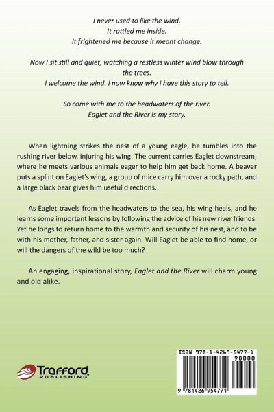 I never used to like the wind. It rattled me inside. It frightened me because it meant change. Now I sit still and quiet, watching a restless winter wind blow through the trees. I welcome the wind. I now know why I have this story to tell. So come with me to the headwaters of the river. Eaglet and the River is my story. When lightning strikes the nest of a young eagle, he tumbles into the rushing river below, injuring his wing. The current carries Eaglet downstream, where he meets various animals eager to help him get back home. A beaver puts a splint on Eaglet's wing, a group of mice carry him over a rocky path, and a large black bear gives him useful directions. As Eaglet travels from the headwaters to the sea, his wing heals, and he learns some important lessons by following the advice of his new river friends. Yet he longs to return home to the warmth and security of his nest, and to be with his mother, father, and sister again. Will Eaglet be able to find home, or will the dangers of the wild be too much? An engaging, inspirational story, Eaglet and the River will charm young and old alike.