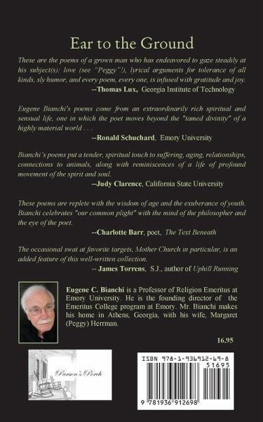 These are the poems of a grown man who has endeavored to gaze steadily at his subject(s): love (see "Peggy"!), lyrical arguments for tolerance of all kinds, sly humor, and every poem, every one, is infused with gratitude and joy. --Thomas Lux, Georgia Institute of Technology Eugene Bianchi's poems come from an extraordinarily rich spiritual and sensual life, one in which the poet moves beyond the "tamed divinity" of a highly material world . . . --Ronald Schuchard, Emory University Bianchi's poems put a tender, spiritual touch to suffering, aging, relationships, connections to animals, along with reminiscences of a life of profound movement of the spirit and soul. --Judy Clarence, California State University These poems are replete with the wisdom of age and the exuberance of youth. Bianchi celebrates "our common plight" with the mind of the philosopher and the eye of the poet. --Charlotte Barr, poet, The Text Beneath The occasional swat at favorite targets, Mother Church in particular, is an added feature of this well-written collection. -- James Torrens, S.J., author