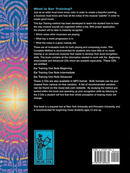 This edition comes with no CDs. You must purchase either the 3 associated CDs separately or digitally download the CDs from an on-line vendor. Otherwise this book is exactly the same as the book/CD edition. Just as an artist must know every color in order to create a beautiful painting, a musician must know and hear all the notes of the musical "palette" in order to create good music. This Ear Training method has been developed to teach the student how to hear the way musical sounds are organized within a key. With proper application, the student will be able to instantly recognize: . Which notes other musicians are playing. . What key a chord progression is in. . What the notes in a given melody are. These are all invaluable tools for both playing and composing music. This Complete Method is recommended for students who have little or no music training or an advanced musician that needs to develop their aural recognition skills. This book contains all the information needed to work with the Beginning, Intermediate and Advanced CDs which as mentioned are avaiable separately. These CDs are entitled: Ear Training One Note Beginning Ear Training One Note Intermediate Ear Training One Note Advanced These 3 CDs are also available in MP3 format. Both formats can be purchased from various on-line vendors. A list of recommended vendors can be found on the muse-eek.com website. By studying the method presented within this book and speeding up your recognition skills by listening to the 3 CDs a student will find that their whole preception of hearing music will change. This book is a required text at New York University and Princeton University, and is recommended for beginning music students ages 13 and up.