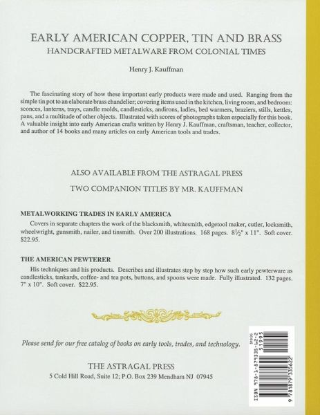This is the fascinating story of how these important early products were made and used, ranging from the simple tin pot to an elaborate brass chandelier. The book covers items used in the kitchen, living room, and bedroom: sconces, lanterns, trays, candle molds, candlesticks, andirons, ladles, bed warmers, braziers, stills, kettles, pans, and a multitude of other objects