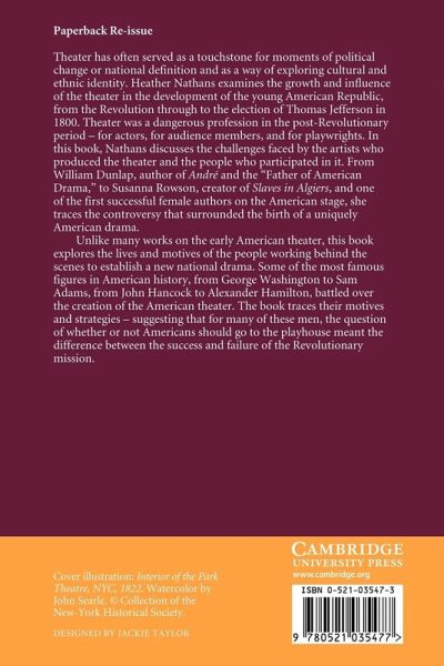 Theatre has often served as a touchstone for moments of political change or national definition and as a way of exploring cultural and ethnic identity. Heather Nathans examines the growth and influence of the theatre in the development of the young American Republic, from the Revolution through to the election of Thomas Jefferson in 1800. Unlike many works on the early American theatre, this book explores the lives and motives of the people working behind the scenes to establish a new national drama. Some of the most famous figures in American history, from George Washington to Sam Adams, from John Hancock to Alexander Hamilton, battled over the creation of the American theatre. The book traces their motives and strategies - suggesting that for many of these men, the question of whether or not Americans should go to the playhouse meant the difference between the success and failure of the Revolutionary mission.