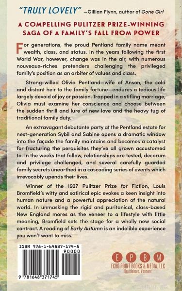 A Compelling Pulitzer Prize-Winning Saga of a Family's Fall from Power "TRULY LOVELY" -Gillian Flynn, author of Gone Girl For generations, the proud Pentland family name meant wealth, class, and status. In the years following the first World War, however, change was in the air, with numerous nouveaux-riches pretenders challenging the privileged family's position as an arbiter of values and class. Strong-willed Olivia Pentland-wife of Anson, the cold and distant heir to the family fortune-endures a tedious life largely devoid of joy or passion. Trapped in a stifling marriage, Olivia must examine her conscience and choose between the sudden thrill and lure of new love and the heavy tug of traditional family duty. An extravagant debutante party at the Pentland estate for next-generation Sybil and Sabine opens a dramatic window into the façade the family maintains and becomes a catalyst for fracturing the perquisites they've all grown accustomed to. In the weeks that follow, relationships are tested, decorum and privilege challenged, and several carefully guarded family secrets unearthed in a cascading series of events which irrevocably upends their lives. Winner of the 1927 Pulitzer Prize for Fiction, Louis Bromfield's witty and satirical epic evokes a keen insight into human nature and a powerful appreciation of the natural world. In unmasking the rigid and puritanical, class-based New England mores as the veneer to a lifestyle with little meaning, Bromfield sets the stage for a wholly new social contract. A reading of Early Autumn is an indelible experience you won't want to miss. This book is also available from Echo Point Books as a hardcover (ISBN 1648371736).
