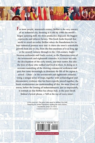 For most people, nineteenth-century Belfast is the very essence of an industrial city, boasting as it did by 1900 the world's largest spinning mill, the most productive shipyard, the biggest ropeworks and tobacco factory. This book looks beyond that world to reveal an earlier Belfast where the foundations for its later industrial prowess were laid. It charts the town's remarkable growth from site to city, from the first mentions of it as long ago as the seventh century through to the 13th-century Anglo-Norman settlement and Gaelic revival, to the Plantation town of the seventeenth and eighteenth centuries. It re-traces not only the development of the early streets, and their names, but also the lives of those who walked and lived in them. In doing so it recreates something of the thriving commercial settlement and port that came increasingly to dominate the life of the region it served - Ulster - in the seventeenth and eighteenth centuries." "Using a unique series of maps, together with archaeological and documentary evidence that has been expertly pieced together, the book revolutionises our understanding of this, the most Ulster of towns, before the coming of industrialisation. Just as importantly, it reminds us that Belfast has always stood, in the poet Derek Mahon's lyrical phrase, a 'hill at the top of every street.