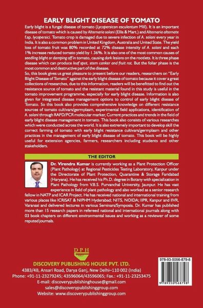 Early blight is a fungal disease of tomato (Lycopersicon esculentum Mill). It is an important disease of tomato which is caused by Alternaria solani (Ellis & Mart.) and Alternaria alternate f.sp. lycopersici. Tomato crop is damaged due to severe infection of A. solani every year in India.this book gives us great pleasure to present before our readers, researchers on "Early Blight Disease of Tomato" against the early blight disease of tomato because it cover a great collections of researches, due to this information, readers will be benefitted to find out the resistance source of tomato and the resistant material found in this study is useful in the tomato improvement programme, especially for early blight disease.