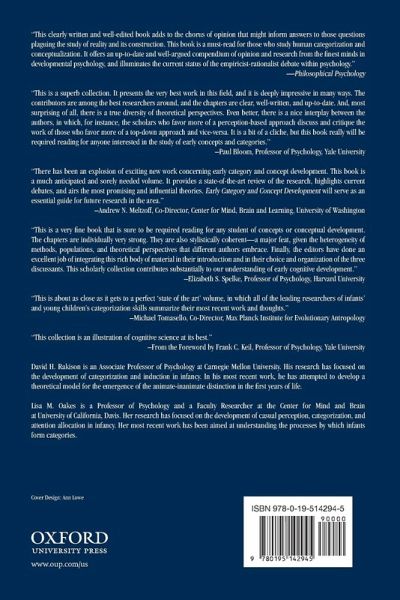 This is the first book devoted entirely to the development of categorization and conceptual abilities during the first years of life, a central topic in developmental psychology and cognitive science. Rakison and Oakes have brought together the leading investigators of categorization of speech, visual-spatial patterns, objects, and of animals. Also included are theoretical chapters on the development of categorization, both from connectionist and from more rationalist perspectives. Providing an overview of the research in the field during the past 25 years, this volume highlights current issues under debate, describes the most exciting and influential theories currently in the field, and acts as a guide to future research endeavors.